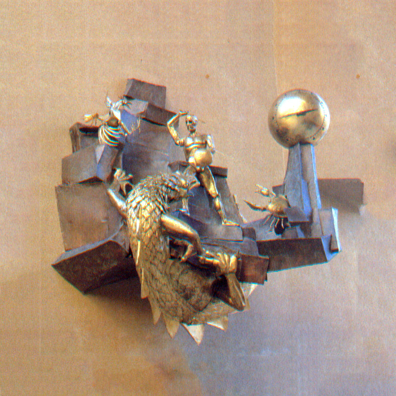 The Defender of Time victoriously fights the 3 animals that surround him : the crab, the dragon and bird representing respectively the sea, the earth and the sky. On the hour (between 9 am and 10 pm) the man is attacked by one of the three animals programmed to appear randomly. At 12.00, 6 pm and 10 p.m, he is attacked by the three animals at the same time. A few seconds before the hour, you can hear 3 knocks to announce the show. A bronze drum strikes the hour. Sea waves breaking, rumbling earth and blowing wind accompany the fights. The figures and animals, animated by pneumatic actuators, are made of hammered and polished brass. The rocks are made of oxidized brass.